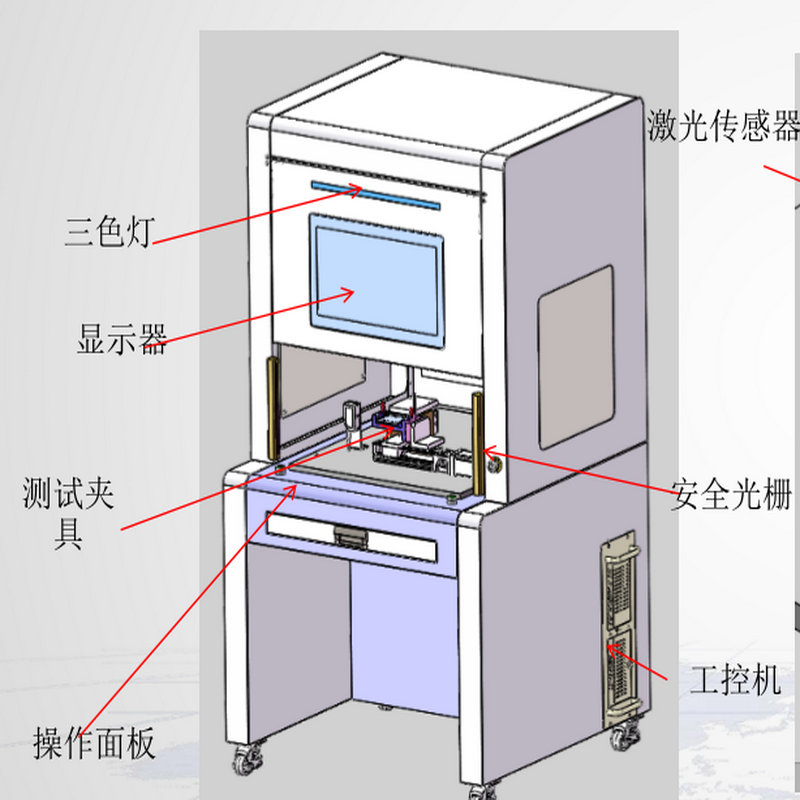 该设备应用于折叠手机转轴X方向左右两端或Y方向,在规定力的情况下虚位的变化测试,设备搭配两套(X向Y向)推力装置,可分别进行测试X方向两边、Y方向的的虚位测试。
