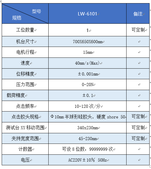 产品介绍:通过电脑控制音圈马达带动测试头按压屏幕。精确的运动控制机构可以保证位移和速度的准确定。力量传感器实时监控测试过程中的压力值,并保存至电脑软件,进行数据分析和判定。